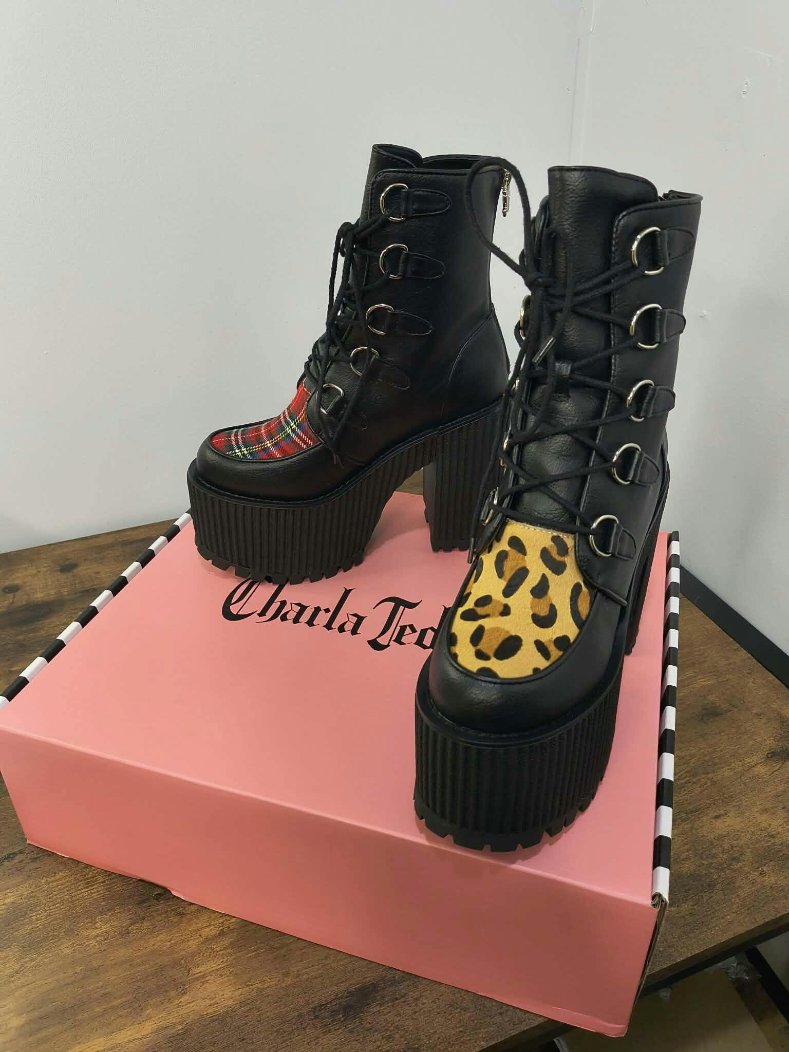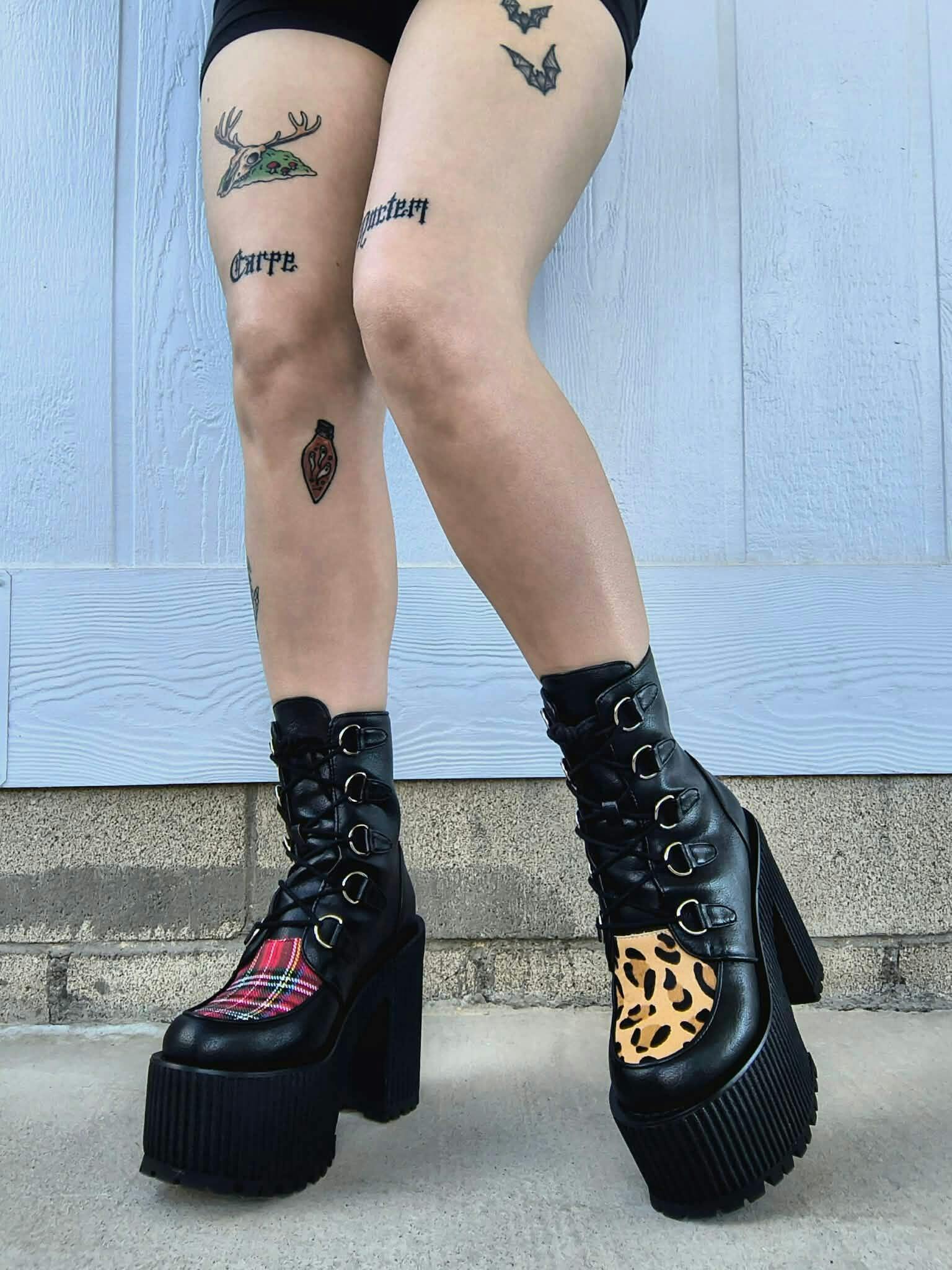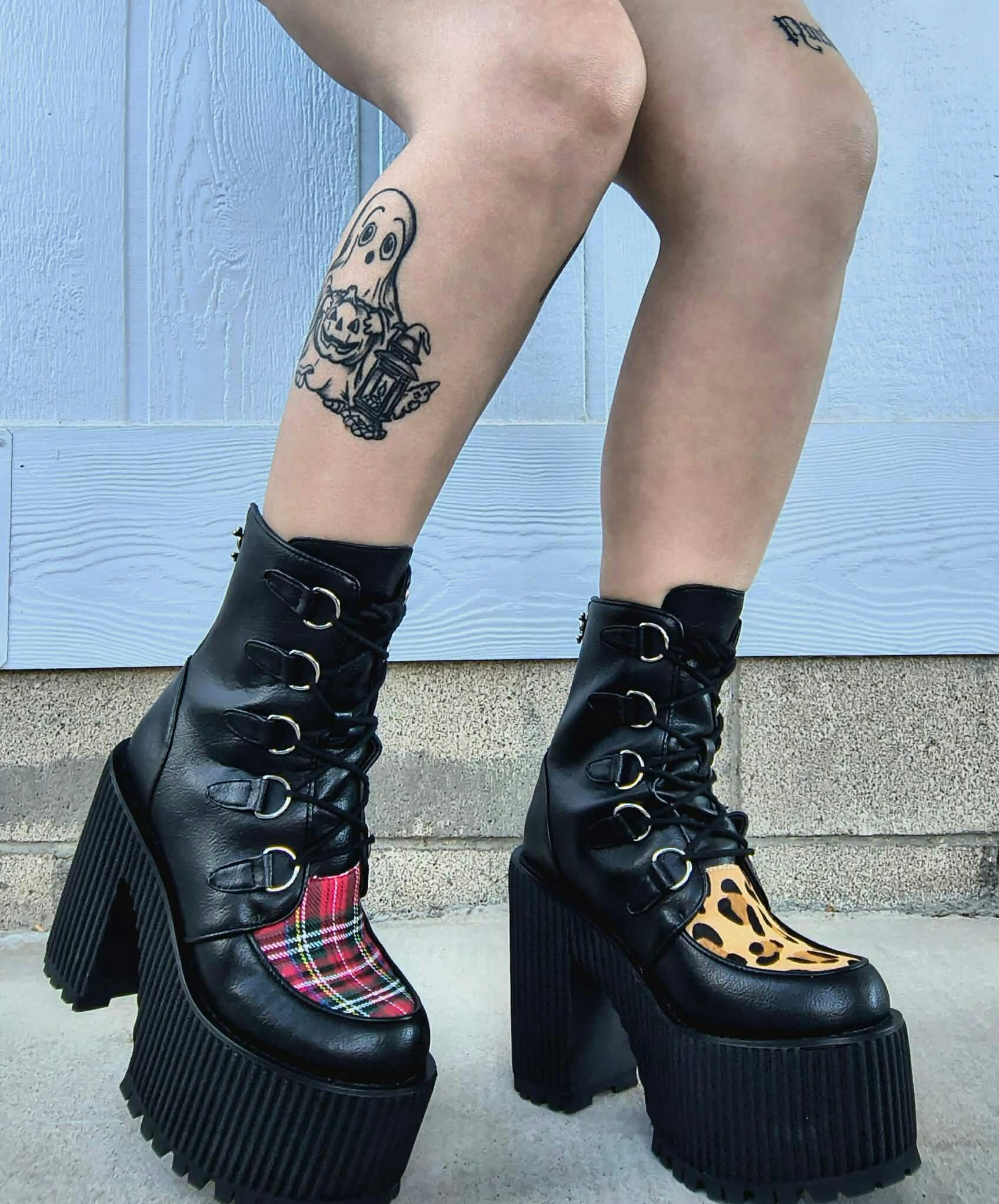 - Left shoe: tartan textile vamp contrast